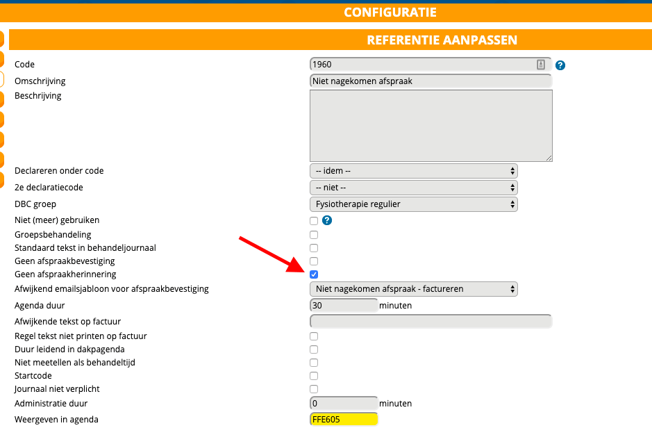 U kunt dit instellen via configuratie – declareren – prestatiecodes. Klik op het kladblokje voor de betreffende prestatiecode. Zet een vinkje achter ‘geen afspraakherinnering’. Op het moment dat deze prestatiecode gebruikt wordt bij het inplannen van een afspraak, wordt er geen herinnering uitgestuurd. U kunt dit bijvoorbeeld gebruiken de prestatiecode ‘niet nagekomen afspraak’.