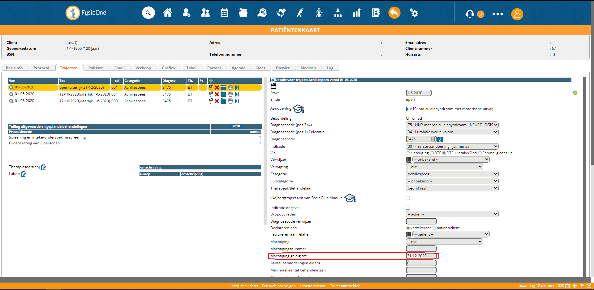 Een traject is gestart op 1-3-2020 op diagnosecode 3475 (HNP) en indicatiecode 008. Hier zit een indicatieperiode aan vast van 3 maanden. Er wordt een vervolgtraject aangemaakt op 1-5-2020 op indicatiecode 001. Vanaf 1-6-2020 (3 maanden = indicatie periode) is de chronische indicatie verlopen. Als er op dat moment een vervolgtraject op indicatiecode 009 wordt gemaakt, zal de indicatie periode handmatig aangepast moeten worden. Dit kan in ‘Details voor traject’ door het veld ‘Machtiging geldig tot’ in te vullen. Door hier een datum in te vullen zal de datum achter het 009 traject worden gewijzigd. Zie screenshot.