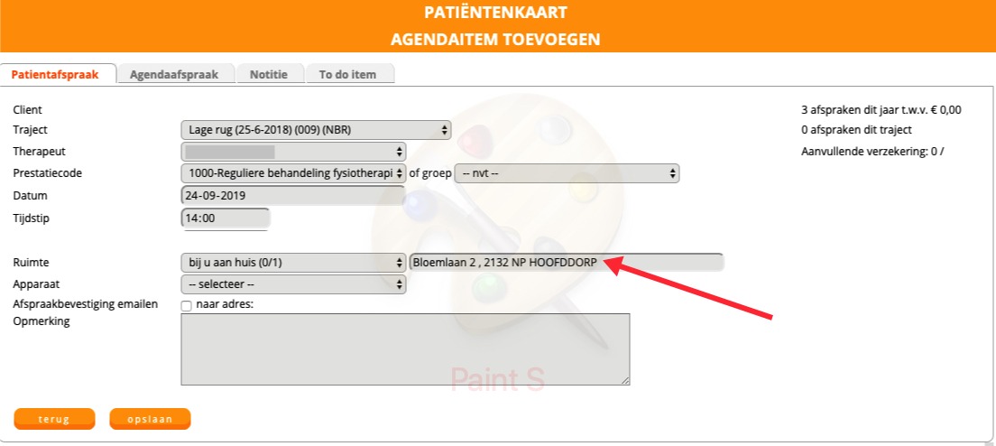 Bij het inplannen van een ‘aan huis’ behandeling verschijnt een tweede tekstvak (zie onderstaande afbeelding). Hier wordt standaard het thuisadres ingevuld van de patiënt (het adres wat ingevuld staat bij de basisinfo).
