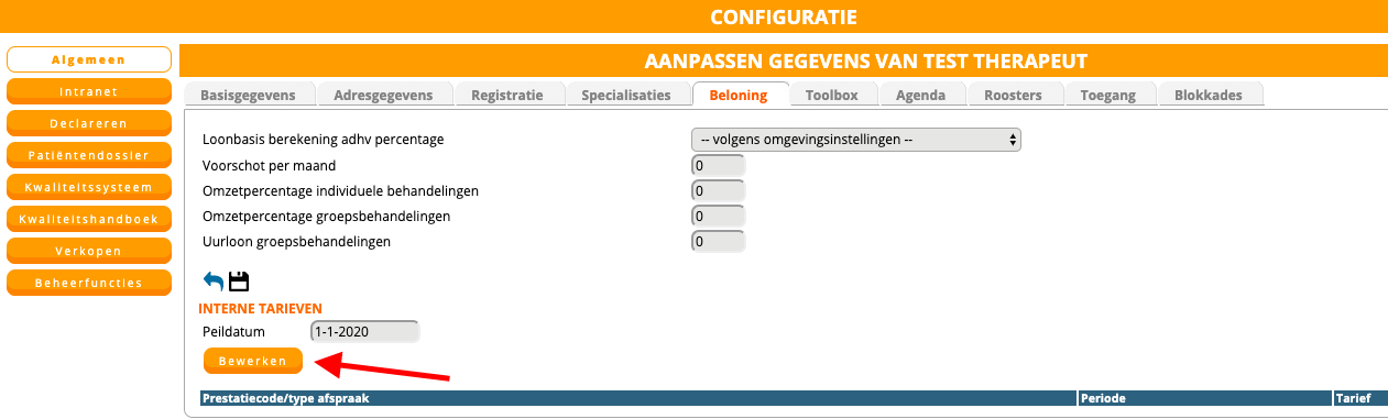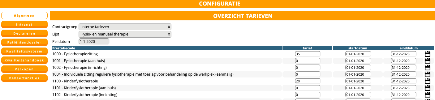 Configuratie > Algemeen > Declaratie tarieven > (contractgroep) interne tarieven
