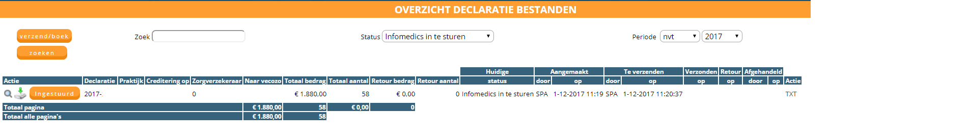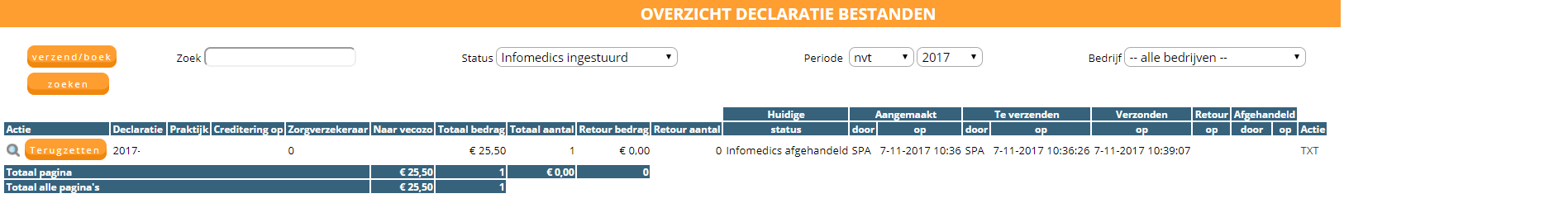 4. Het bestand krijgt nu de status ‘Infomedics ingestuurd’. U heeft altijd de mogelijkheid om het bestand een status terug te zetten. Dit kunt u doen door op de knop ‘terugzetten’ te klikken.