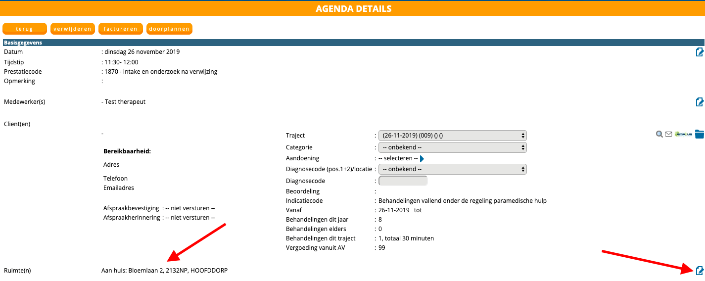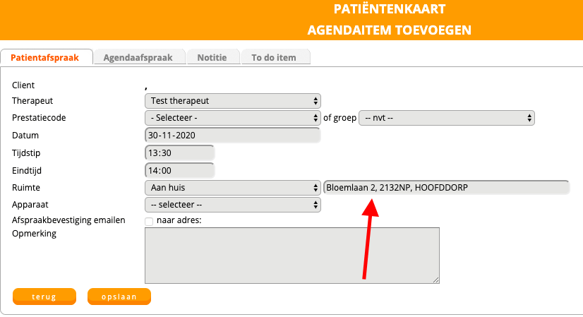 Op het moment dat u nu een afspraak plant in de agenda en u zet de ruimte op ‘aan huis’, dan ziet u direct het adres van de patiënt zichtbaar worden. Dit is het adres dat ingevuld staat in de ‘basisinfo’. U heeft hierbij ook direct de mogelijkheid om het adres aan te passen.