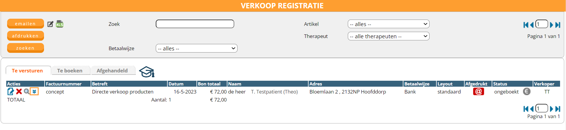 Wanneer u een nota wilt aanpassen maar deze staat al onder verkopen – te versturen dan kunt u deze handmatig wijzigen door op de twee blauwe pijltjes voor de nota de klikken. De wijzigingen die u aanbrengt via configuratie – algemeen – omgevinginstellingen – factuurlayout zijn niet zichtbaar bij nota’s die aan aangemaakt zijn onder verkoop – te versturen.