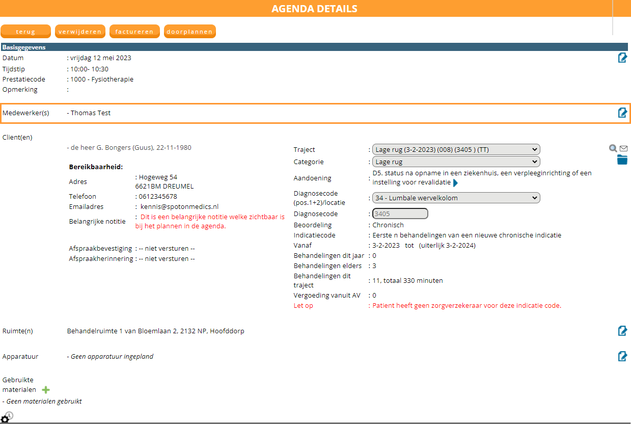 Om een agenda afspraak bij meerdere medewerkers in de agenda te plaatsen, dient u de afspraak bij één therapeut geplaatst te hebben. Vervolgens klikt u op de afspraak om in de agenda details uit te komen. Klik in de agenda details op het kladblokje achter de therapeut om meerdere therapeuten aan te vinken waarbij de afspraak ook in de agenda dient te staan. Wanneer u een therapeut uit de agenda afspraak wil verwijderen dan vinkt u het vakje bij de desbetreffende therapeut uit.