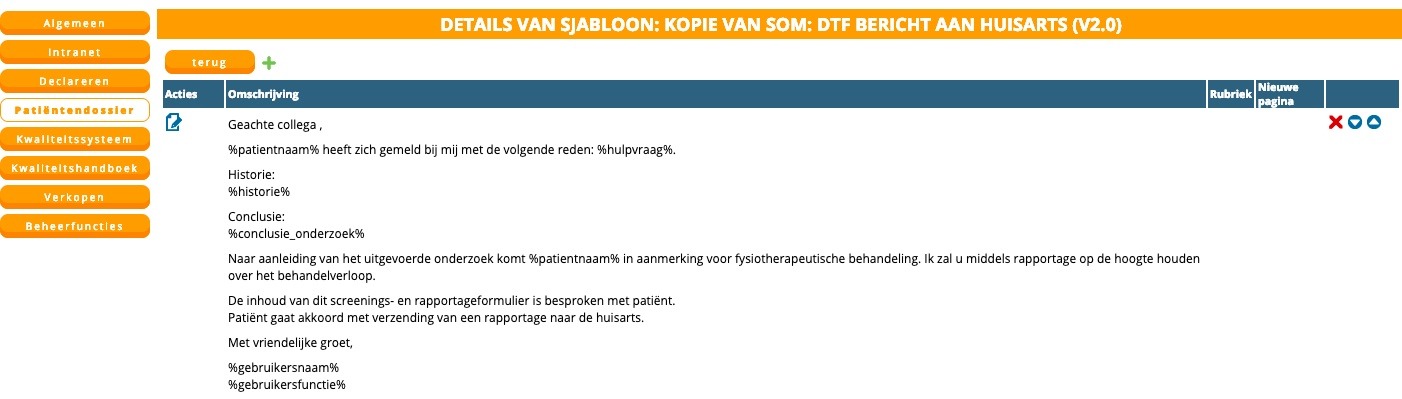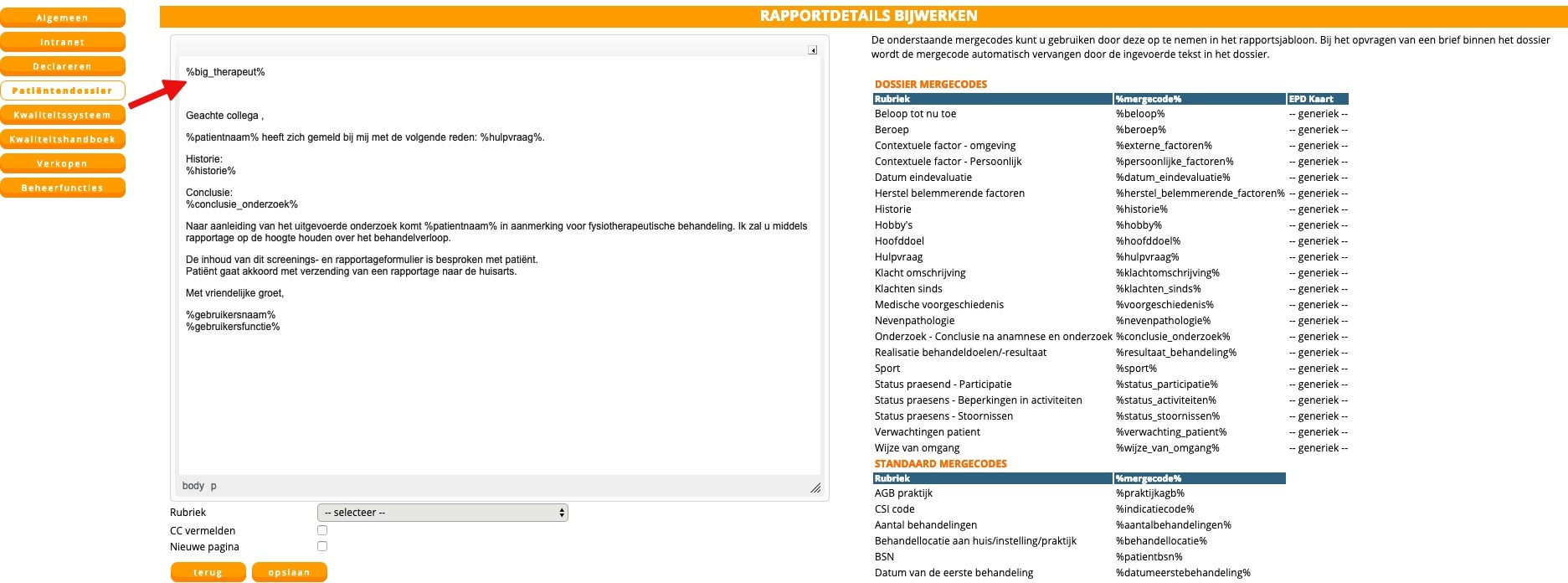U dient onder Acties op het ‘kladblokje’ te klikken. Vergeet niet op de knop ‘opslaan’ te klikken wanneer u de mergecode %big_therapeut% heeft toegevoegd. Als voorbeeld hieronder hoe de mergecode in de rapportage gezet kan worden. U bent vrij deze op een andere plaatst met eventueel gewenste tekst te gebruiken. Let op: het BIG nummer van de ingelogde gebruiker wordt opgenomen in de rapportage.