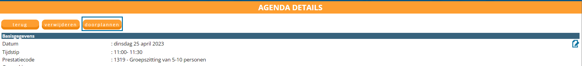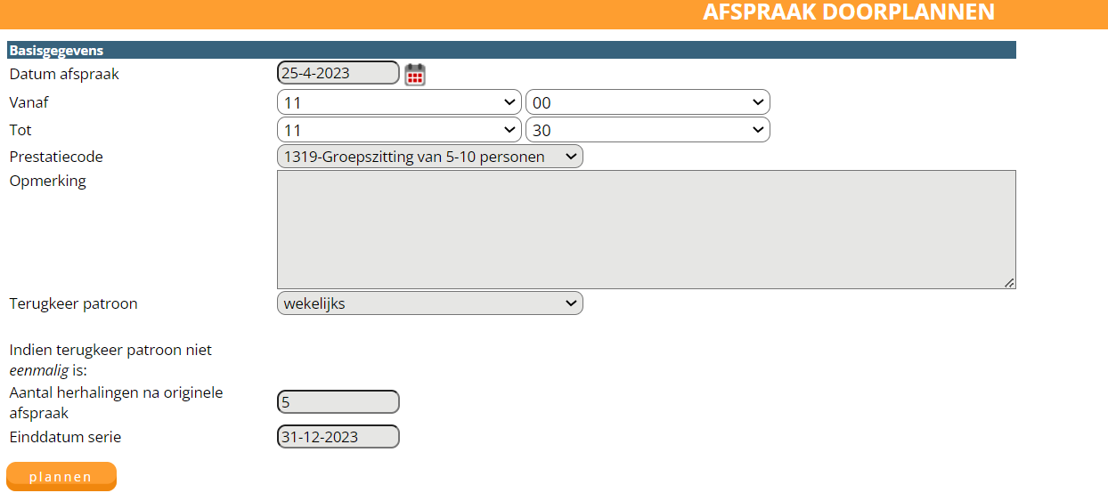 Klik op de naam van de patiënt in de agenda, u wordt doorgeschakeld naar de agenda details. Klik op de knop doorplannen, geef hierbij aan wat het terugkerende patroon moet zijn en hoeveel herhalingen er dienen te komen. Let op: de afspraakbevestiging voor de vervolgafspraken dienen handmatig verstuurd te worden!