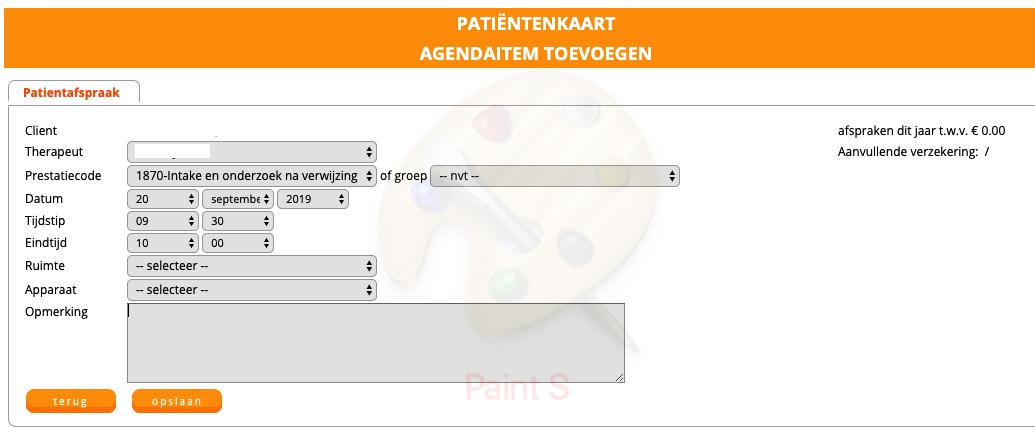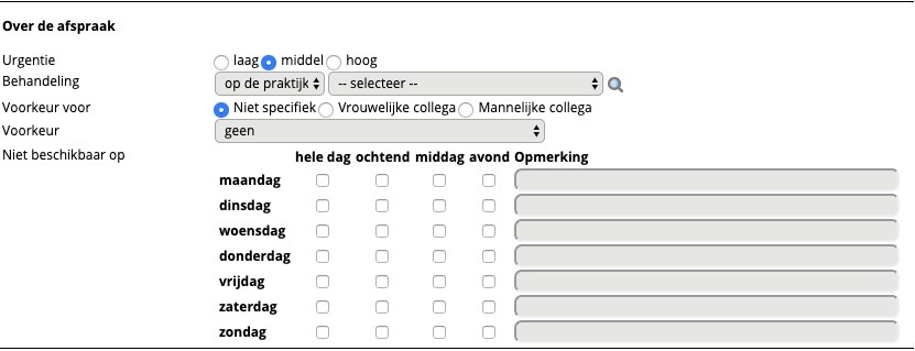 - Voorkeur: selecteer hier eventueel de naam van de therapeut, waarvoor de patient een voorkeur heeft.