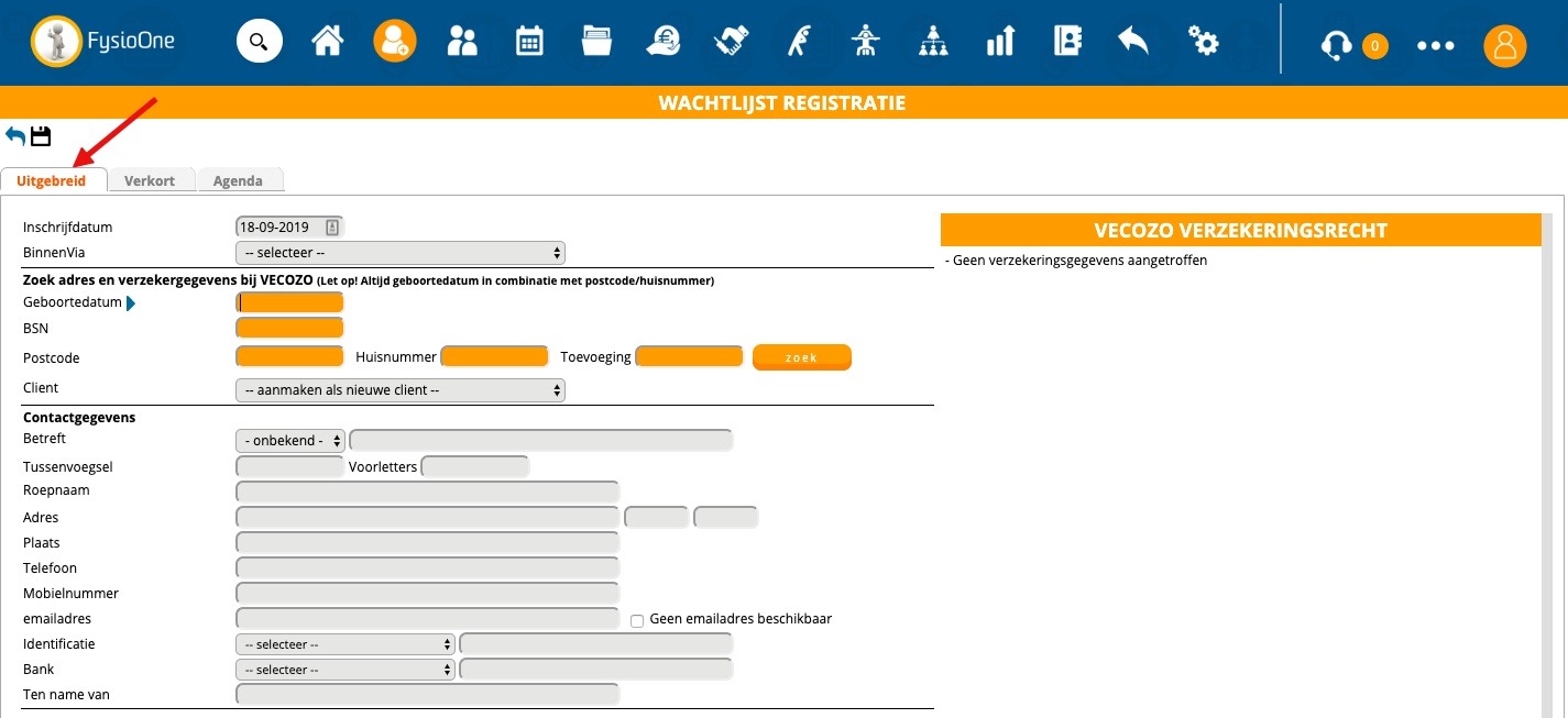 Om een zo volledig mogelijke patiëntenregistratie aan te maken kunt u binnen FysioOne gebruik maken van de ‘Wachtlijst’. Wanneer u inplant via de wachtlijst, wordt er direct een nieuw traject, een nieuw dossier en een volledig mogelijk patiëntenkaart aangemaakt. Om na te gaan wanneer u gebruik dient te maken van de ‘wachtlijst’, verwijzen wij u naar de FAQ: Wanneer plan ik een patiënt in via de wachtlijst?