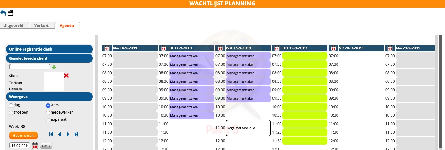 Hiermee wordt u doorverwezen naar de ‘wachtlijst planning’ en kunt u de afspraak inplannen. Onder medewerkers aan de linkerkant, heeft u de mogelijkheid om de agenda van de betreffende therapeut te openen.