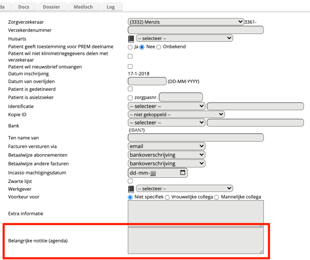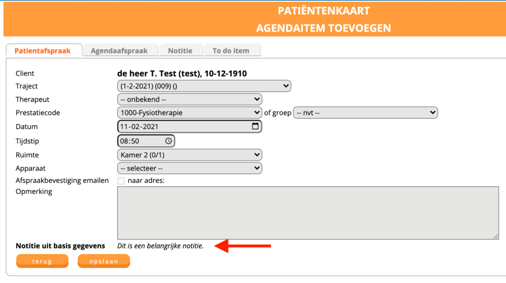 Let op: Wanneer u de tekst verwijderd bij de het onderdeel “belangrijke notitie (agenda)” op het tabblad “basisinfo” in de patiëntenkaart dan zal de belangrijke agenda notitie niet meer getoond worden bij de agenda afspraken.