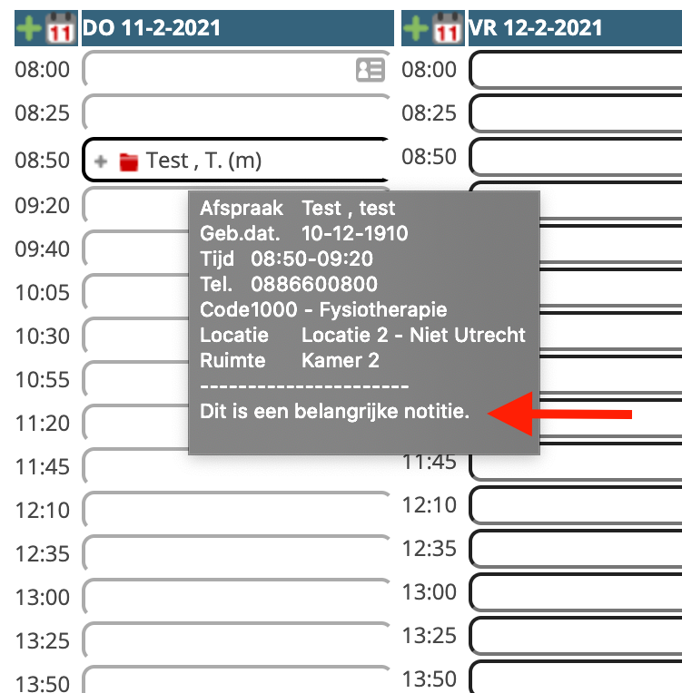 De notitie wordt ook getoond wanneer u met de muis op de afspraak gaat staan (mouseover).