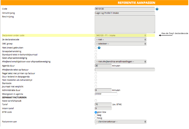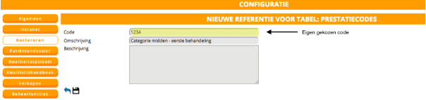 U kiest bij code een eigen gekozen code: dit is NIET de code waarmee u daadwerkelijk declareert aan de zorgverzekeraar. U kunt een eigen code aan de prestatie hangen.