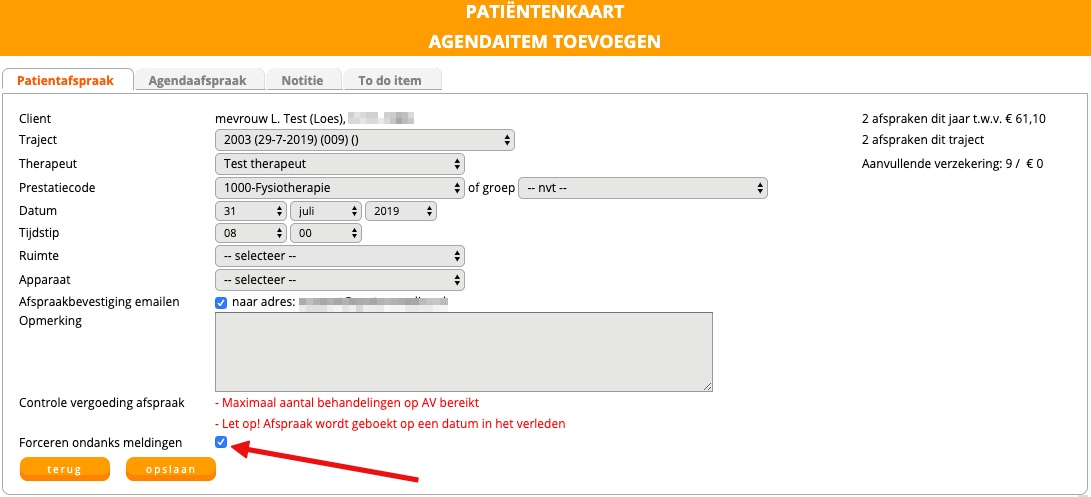 Voorbeeld: stel een patiënt heeft een aanvullende verzekering van 9 behandelingen. Elders heeft deze patiënt al reeds 6 behandelingen gehad. Bij u mag de patiënt nog 3 behandelingen inplannen, voordat deze door zijn aanvullende verzekering is en er een particuliere nota gemaakt dient te worden. Stel u plant voor deze patiënt zijn 4e behandeling in. Dan zal, wanneer u onder de configuratie de juist vinkjes heeft gezet, deze afspraak worden geblokkeerd. Bij het inplannen krijgt u dan wel de mogelijkheid om de afspraak te forceren, zodat het mogelijk blijft om de afspraak in te plannen. Wanneer u in de patiëntenkaart in de log kijkt, dan ziet u altijd wie de melding heeft geforceerd en wanneer dit is gebeurd.