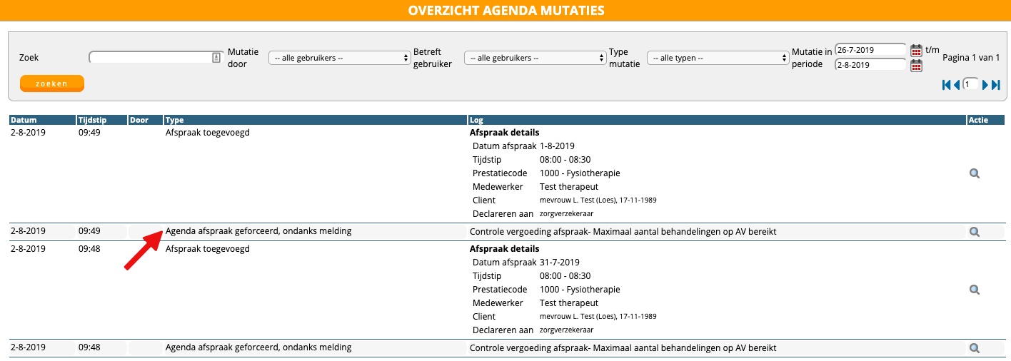 Ook via het totale overzicht van alle agenda mutaties, ziet u de log staan. Zie onderstaande afbeelding.