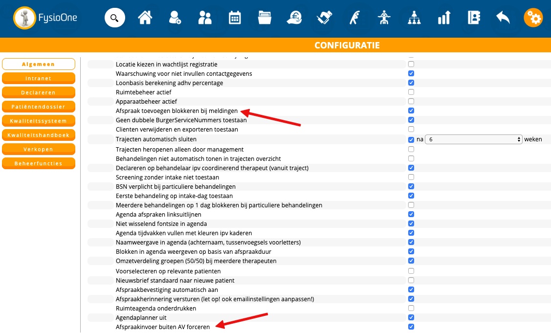 U dient via configuratie – algemeen – omgeving instellingen – een vinkje te zetten achter ‘afspraak toevoegen blokkeren bij meldingen’ – en ‘afspraak invoer buiten AV forceren. Zie onderstaande afbeelding.