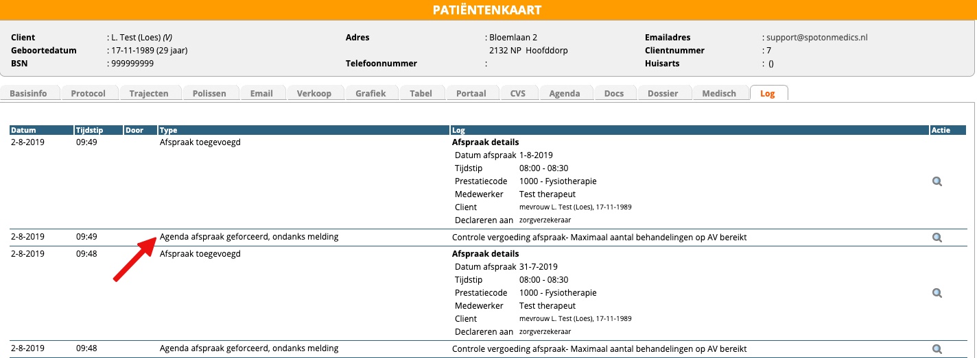Via de patiëntenkaart of agenda log heeft u de mogelijkheid om de log te controleren. Hier ziet u op welke datum, tijdstip, door wie, type en de specifieke log geregistreerd is.