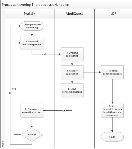 Elke eerste van de maand stuurt het EPD de behandelepisodes middels een XML-bericht naar de KNGF webservice van MediQuest. De webservice controleert de aanlevering op juistheid en volledigheid. De webservice stuurt de resultaten van deze validatie via een XML-bericht terug naar de praktijk. Dit XML-bericht wordt het verwerkingsverslag genoemd.