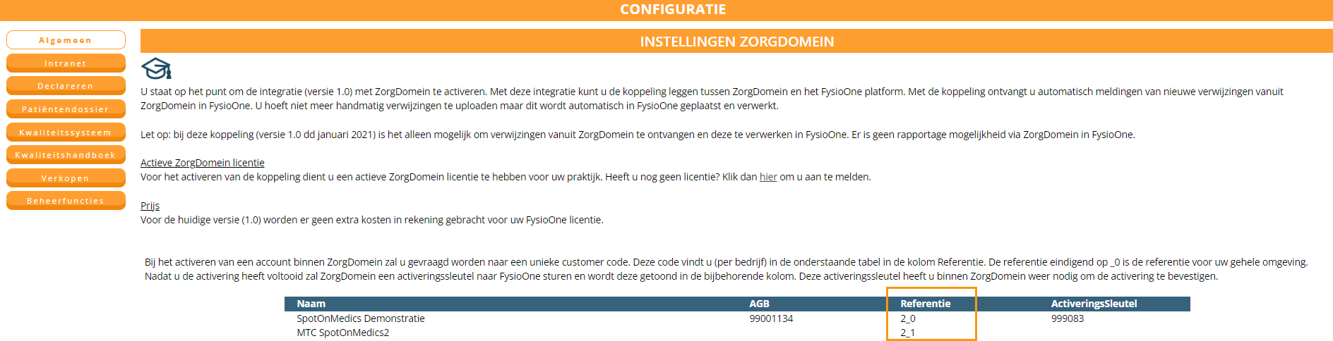 De koppelgegevens kunt u vinden via configuratie – algemeen – ZorgDomein. Hier ziet u onder referentie een nummer staan dat eindigt op _0. Deze referentie dient u geheel in te vullen. Klik hier voor een uitgebreide toelichting.