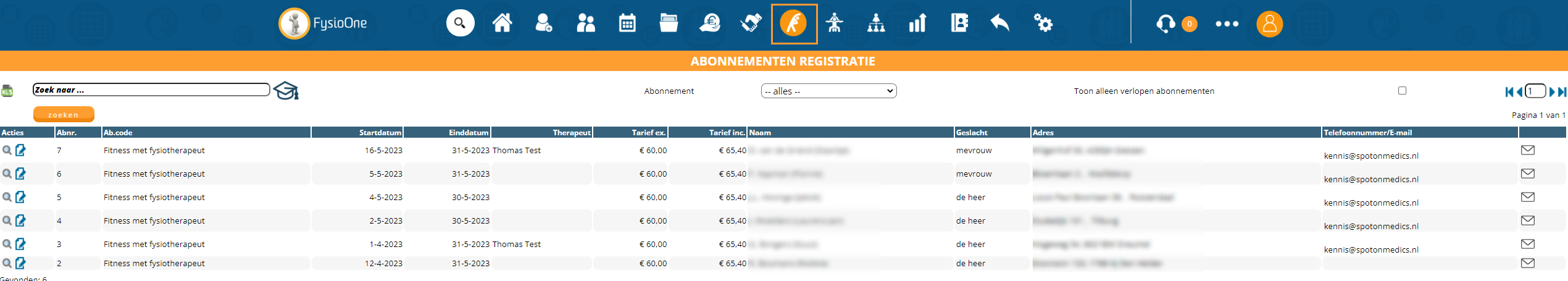 U vindt een overzicht van de gekoppelde abonnementen via het hoofdmenu bij ‘abonnementen’. Hier kunt u filteren op abonnement en verlopen abonnementen. Tevens kunt u zoeken op naam van de patiënt.