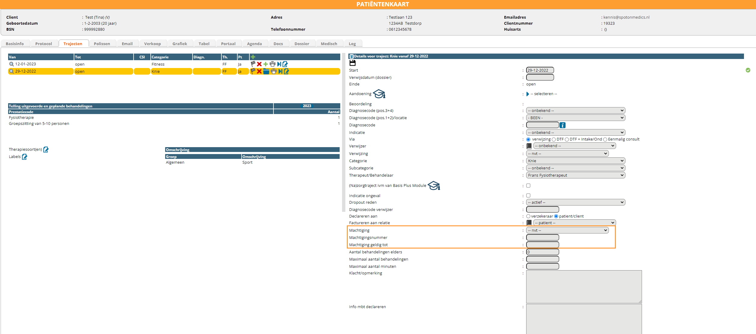 Het kan voorkomen dat uw patiënt een chronische indicatie krijgt toegewezen. Voor het declareren van deze behandelingen heeft u een machtiging vanuit de zorgverzekeraar ontvangen. U voert de einddatum van deze machtiging in onder details voor het traject. Let op u dient de einddatum van de machtiging in het juiste traject in te voeren.