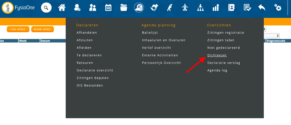 Het overzicht van niet dichtgezette verrichtingen/behandelingen kunt u raadplegen via: hoofdnavigatiemenu – declareren – dichtgezet.