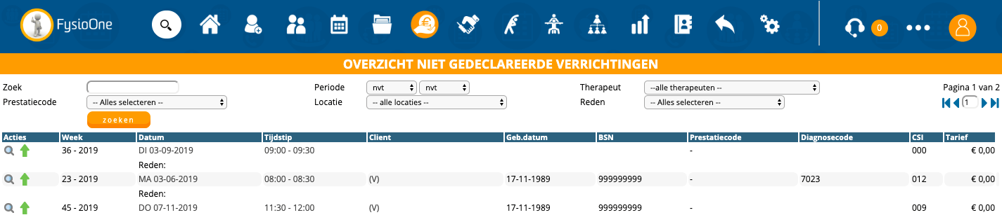 Alle behandelingen die bij afhandelingen, te declareren of retouren staan EN op “niet declareren” zijn gezet krijgen de status ‘niet gedeclareerd’. Het overzicht van niet gedeclareerde verrichtingen/behandelingen kunt u raadplegen via: hoofdnavigatiemenu – declareren – niet gedeclareerd.