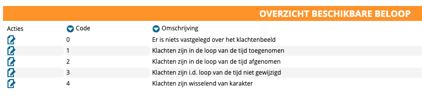 U gaat naar configuratie > patientdossier > beloop. U ziet daar de beschikbare drop-down keuzes voor de rubriek beloop in het anamnese formulier. U ziet in de 2e kolom een code. Deze code dient overeen te komen met de LDF codering voor een correcte aanlevering aan het LDF. Let op open de codering via het kladblok, in het volgende scherm moet u namelijk nogmaals de codering toevoegen!