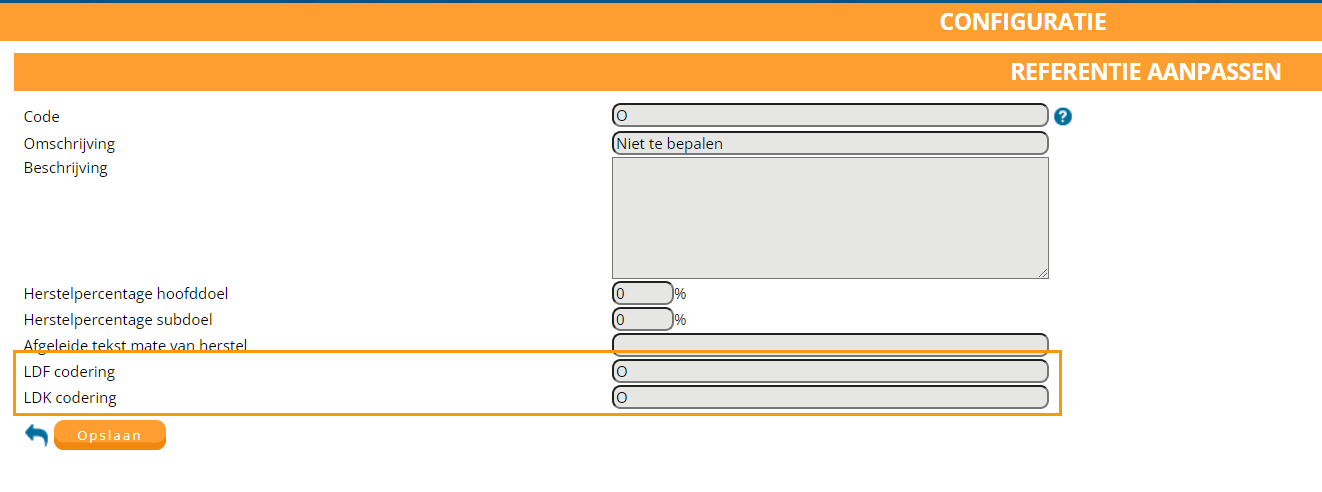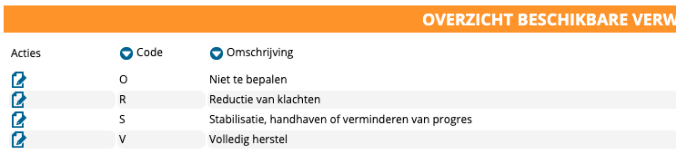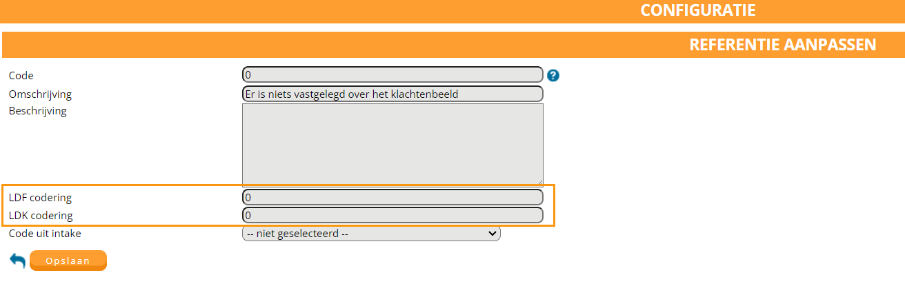 U gaat naar configuratie > patientdossier > verwacht herstel. U ziet daar de beschikbare drop-down keuzes voor de rubriek verwacht herstel in het anamnese formulier. U ziet in de 2e kolom een code. Deze code dient overeen te komen met de LDF codering voor een correcte aanlevering aan het LDF. Let op open de codering via het kladblok, in het volgende scherm moet u namelijk nogmaals de codering toevoegen!