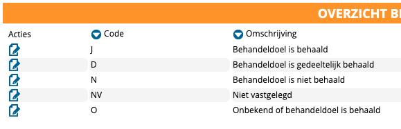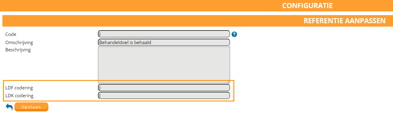 U gaat naar configuratie > patientdossier > resultaat behaald. U ziet daar de beschikbare drop-down keuzes voor de rubriek resultaat behaald in het eindevaluatie formulier. U ziet in de 2e kolom een code. Deze code dient overeen te komen met de LDF codering voor een correcte aanlevering aan het LDF. Let op open de codering via het kladblok, in het volgende scherm moet u namelijk nogmaals de codering toevoegen!