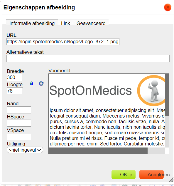 In de URL kunt u de link plakken van uw logo welke u eerder in de omgeving instellingen heeft geupload. Het blauwe slotje rechts van de afmetingen zorgt ervoor dat deze in verhouding blijven. U kunt de afbeelding opslaan door op OK te klikken.
