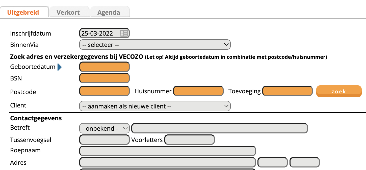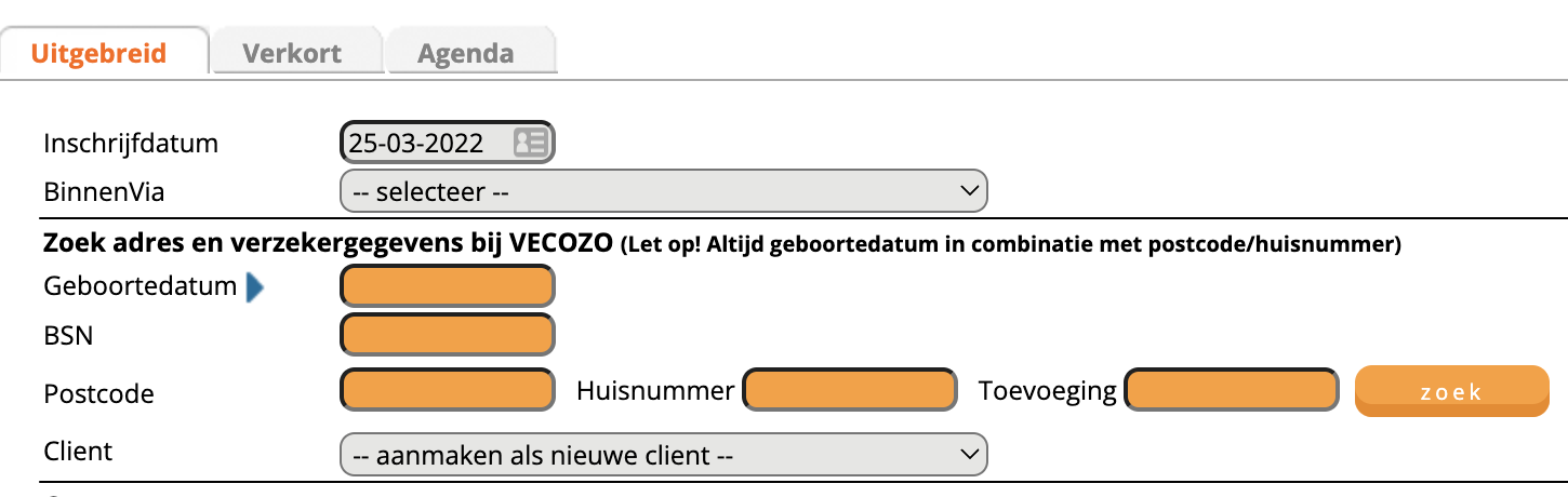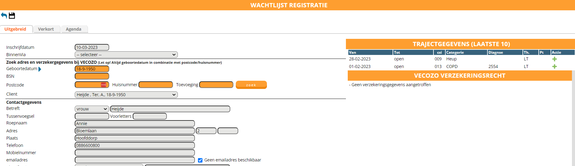 Via de uitgebreide wachtlijst heeft u de mogelijkheid om de verzekeringgegevens van de patiënt via VECOZO op te halen. U kunt de combinatie geboortedatum, postcode/huisnummer invullen of de combinatie geboortedatum en BSN. Door op de knop ‘zoek’ te klikken, worden de gegevens via VECOZO opgehaald. Voor meer informatie over het koppelen met VECOZO kunt u deze handleiding raadplegen.