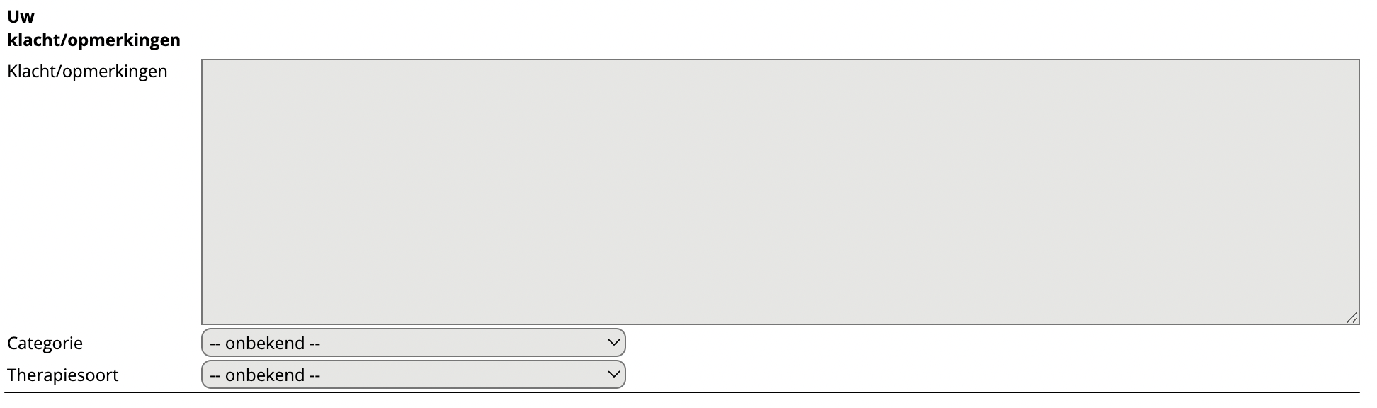 Vul eventueel de klacht van de patiënt in of een opmerking. Door een categorie te selecteren wordt de klinimetrie preset of specialisatiekaart geactiveerd (dit moet wel ingericht zijn!). Wilt u meer informatie over de klinimetrie preset of specialisatiekaarten, dan kunt u deze handleiding raadplegen.