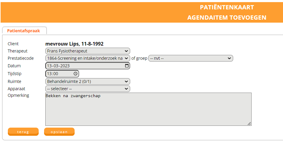 Op deze manier heeft u de volledige wachtlijstregistratie voor een nieuwe patiënt doorlopen. De wachtlijst wordt automatisch opgeslagen en u kunt nu verder werken in FysioOne of de patiënt meteen inplannen via het tabblad “Agenda”.