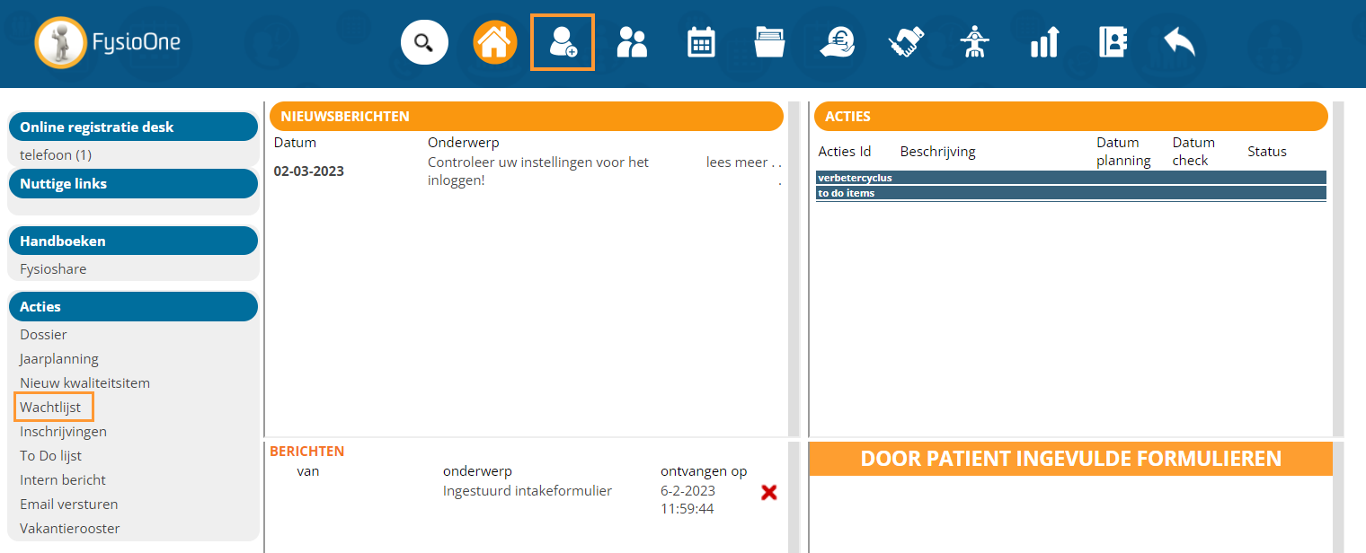 De wachtlijstfunctie maakt het mogelijk om een registratie bij te houden van nieuwe patiënten die zich aanmelden bij de praktijk en de opvolging van die aanmelding. Ook kunt u de wachtlijstfunctie gebruiken wanneer het gaat om een bestaande patiënt die al reeds binnen FysioOne een patiëntenkaart heeft, maar zich nu meldt met een nieuwe klacht.