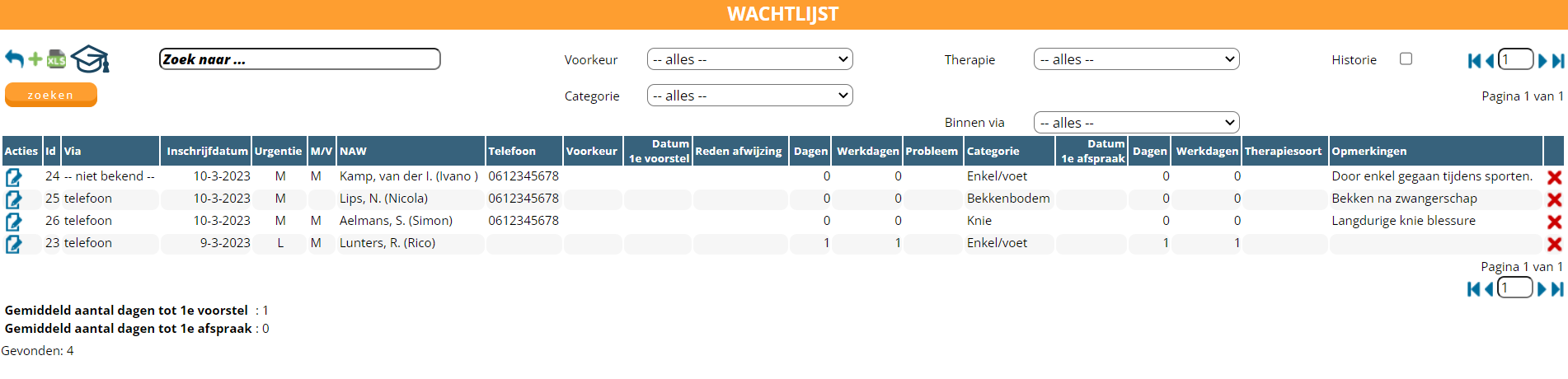 Binnen de wachtlijst heeft u de mogelijkheid om op voorkeur, categorie, therapie en binnen via te filteren. Mocht u binnen de wachtlijst willen zoeken, dan heeft u de mogelijkheid om een naam in te voeren in de ‘zoek naar’ balk. Vergeet niet om op “zoeken” of enter te drukken.