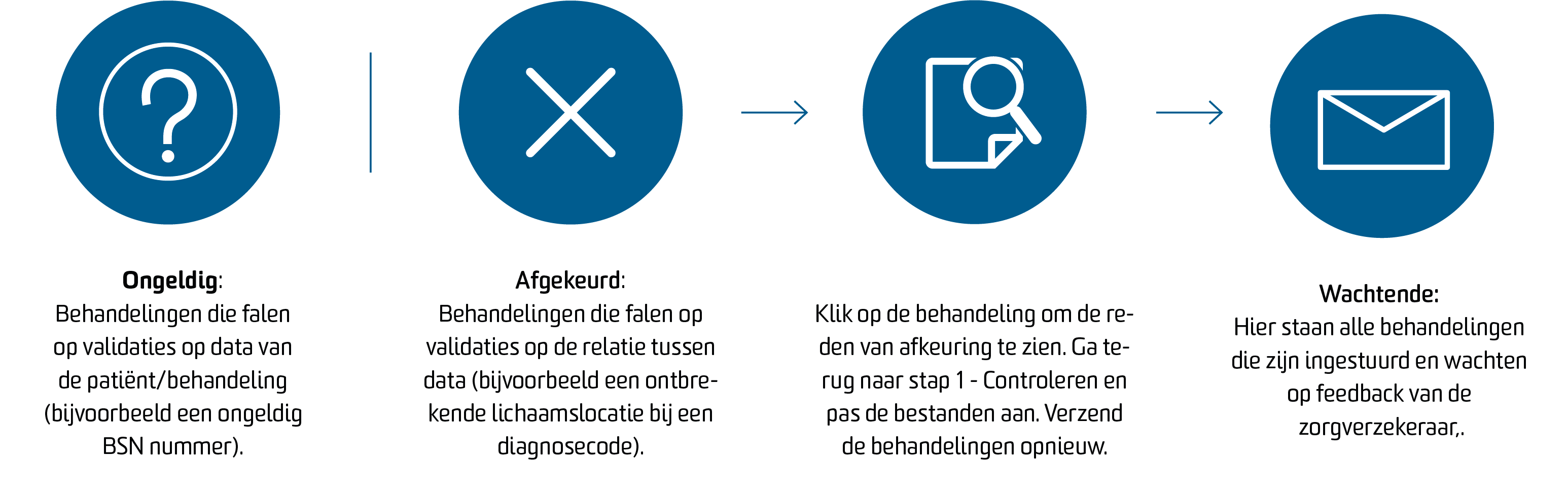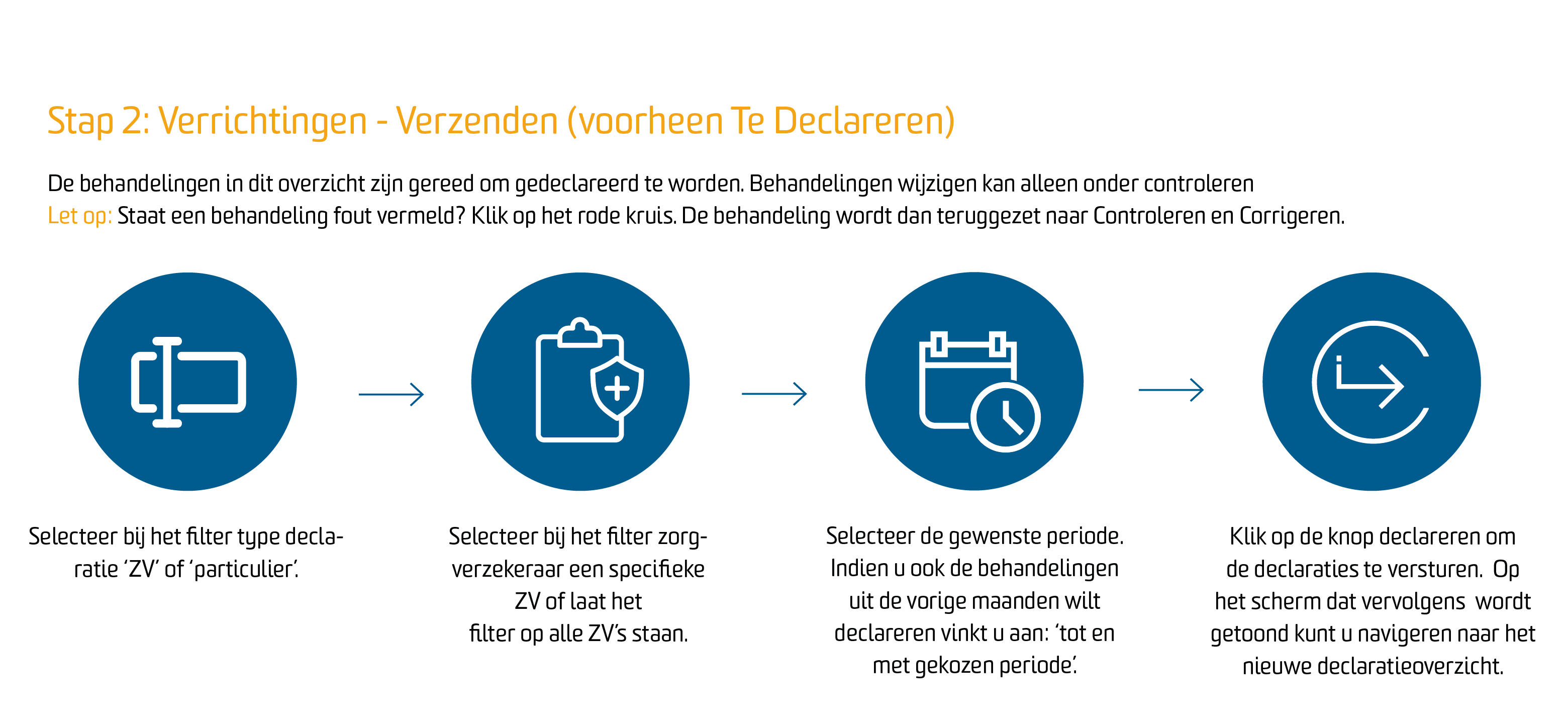 Wanneer u een behandeling heeft ingeplant en uitgevoerd, bevindt deze zich in de declaratieflow. In dit hoofdstuk lichten we u toe welke weg de behandelingen nemen in deze flow en welke handelingen u per stap kunt uitvoeren.