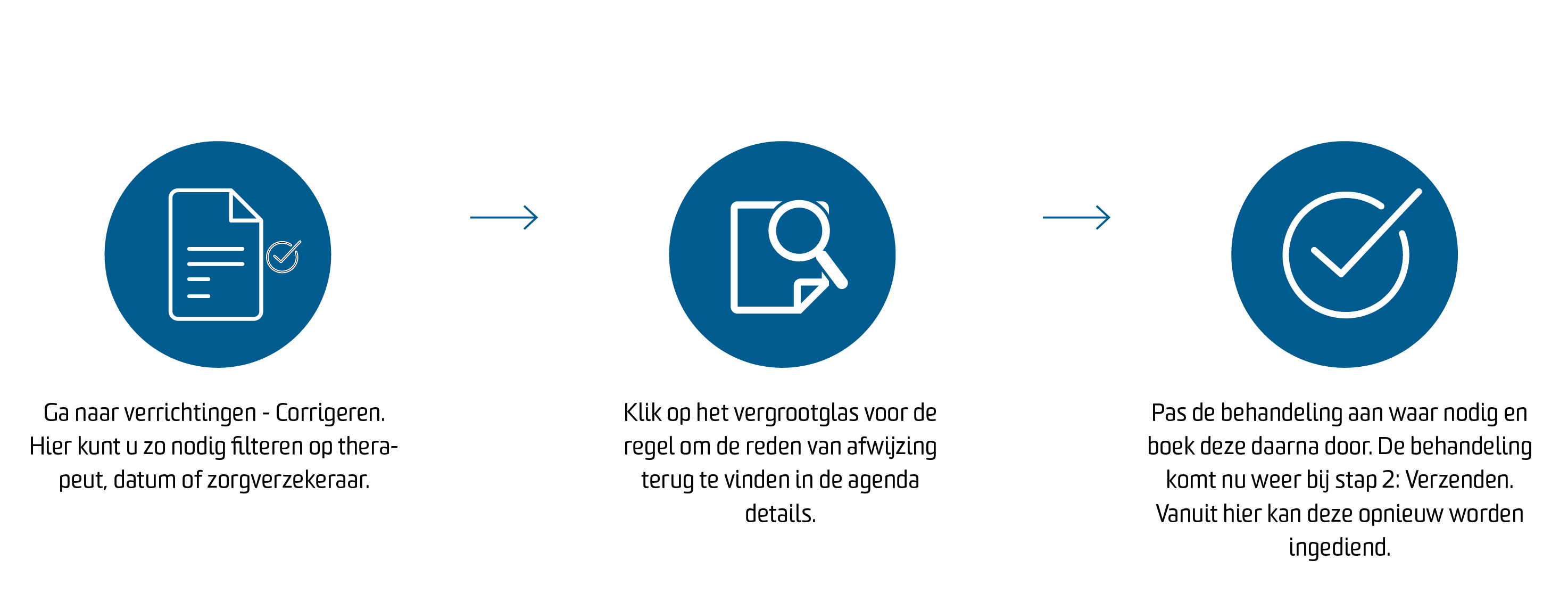 Wanneer de zorgverzekeraar de credit heeft verwerkt, komt de behandeling automatisch open te staan bij Stap 3: Corrigeren. Nadat u de gewenste wijzigingen heeft toegepast, kunt u de behandeling vanuit Corrigeren opnieuw boeken en verzenden.