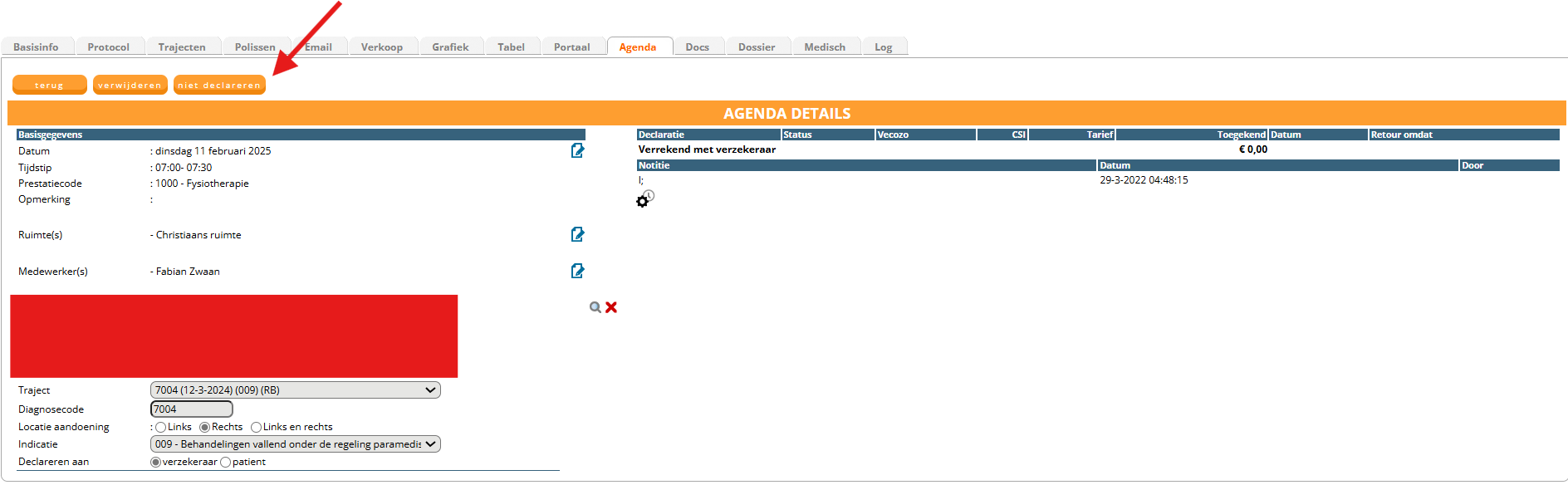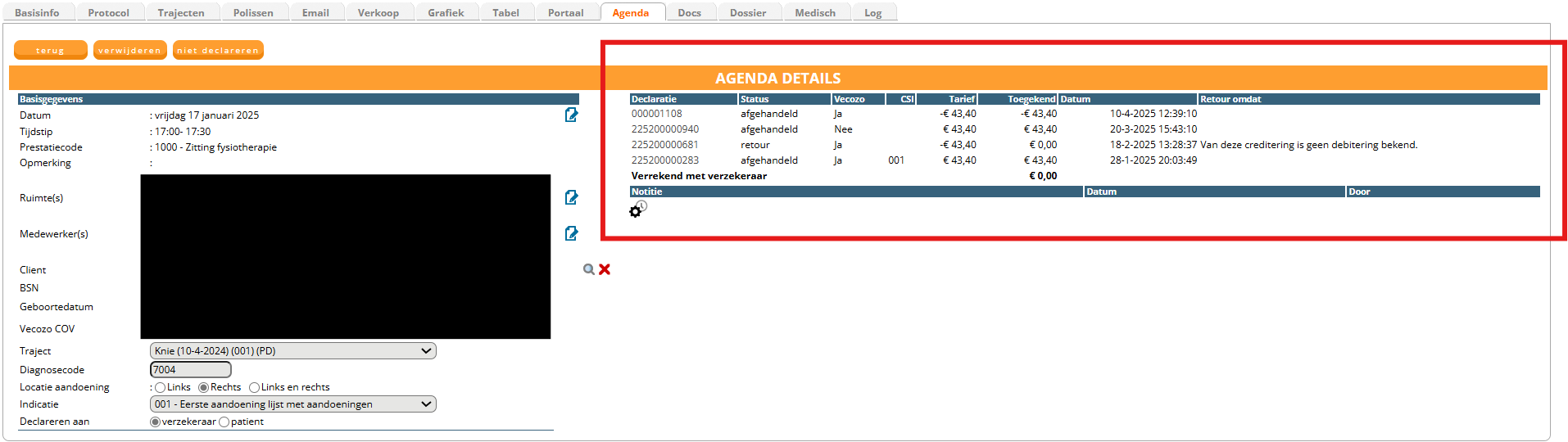 Open de afspraak die u wilt crediteren met het vergrootglas om in de agenda details van de afspraak te komen. Hier ziet u het verloop van de declaratie. U kunt hier op het declaratienummer klikken waarop het bedrag is toegekend dat u wilt terughalen, waardoor u automatisch in het juiste declaratiebestand terechtkomt:
