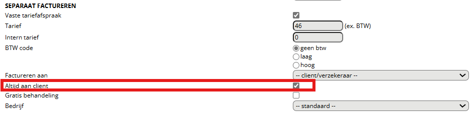 Naast de prestatiecodes die u krijgt van de zorgverzekeraar dient u ook bij elke verrichting een prestatiecode met een nultarief aan te maken. Deze code gebruikt u namelijk om bij te houden hoe vaak de patiënt binnen het beweegprogramma is behandeld. U dient bij deze prestatiecode een vinkje te zetten bij ‘vast tariefafspraak’ – ‘altijd aan cliënt’ en ‘gratis behandeling’.