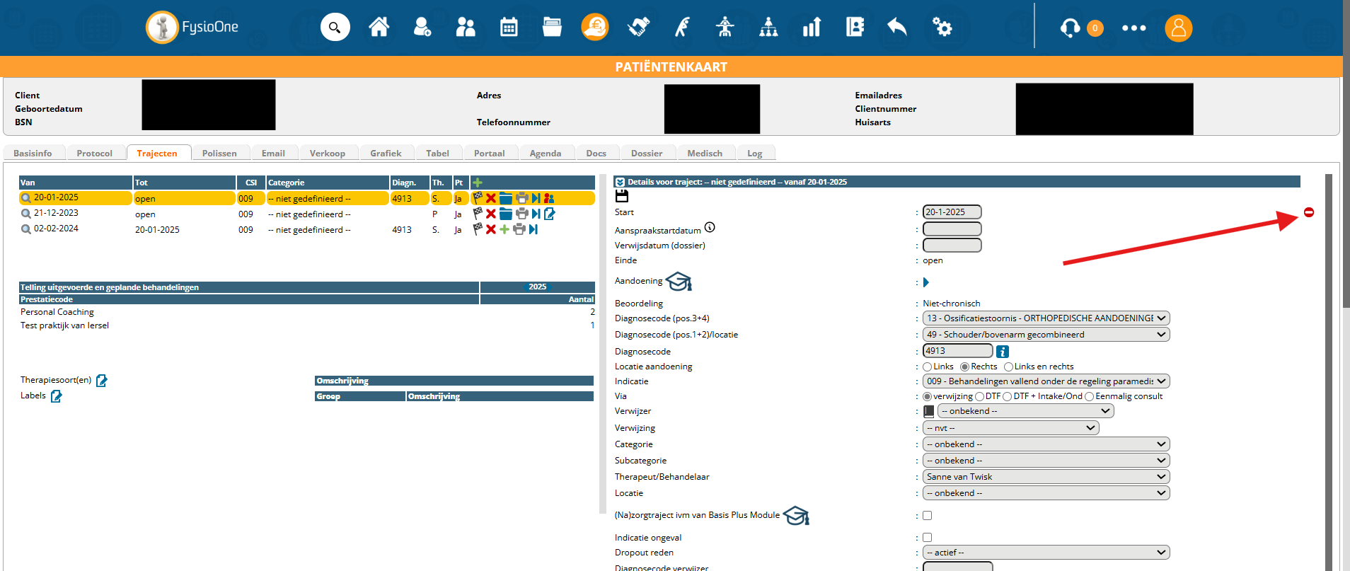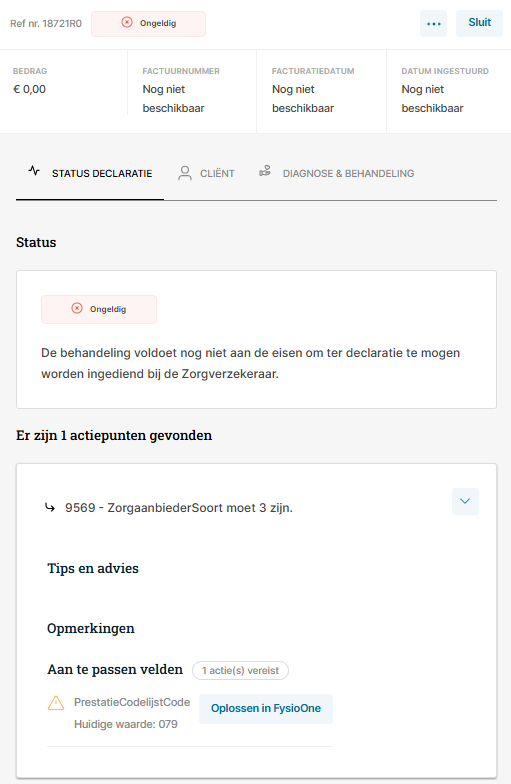 Let op: Ondanks dat u de informatie over de retouren ook kunt terugvinden in het nieuwe declaratieoverzicht, doet u de correcties altijd in FysioOne. Deze voert u meestal uit in de details van het traject. In sommige gevallen dient u iets aan te passen in de basisinformatie van de patiënt, in de gegevens van de verwijzer of ergens anders in het systeem.