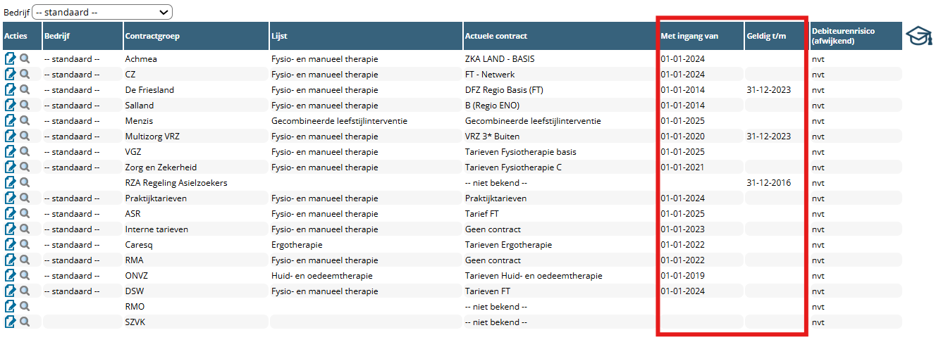 Controleer in het overzicht contractposities of alle contracten met uw zorgverzekeraars zijn ingesteld. Dit doet u bij configuratie > Algemeen> Contractposities.