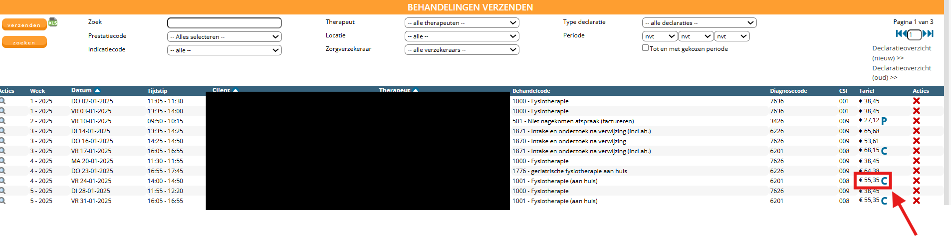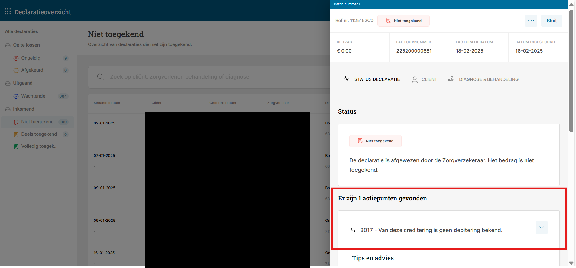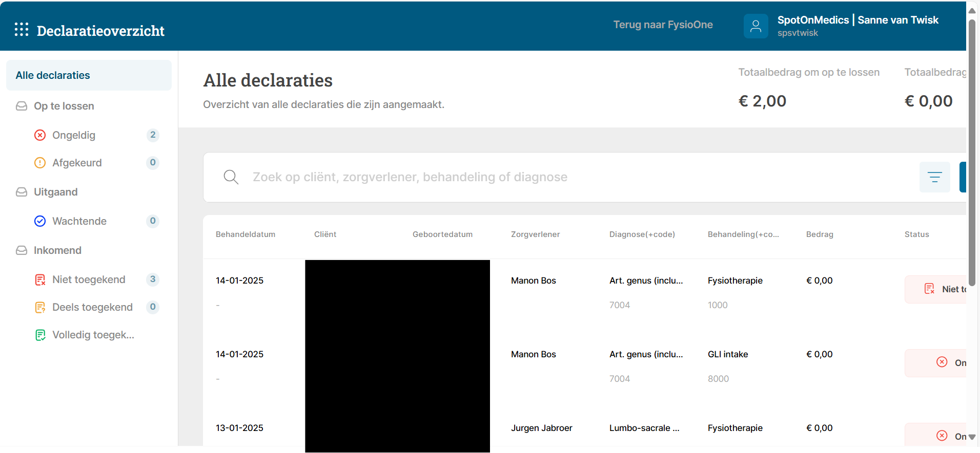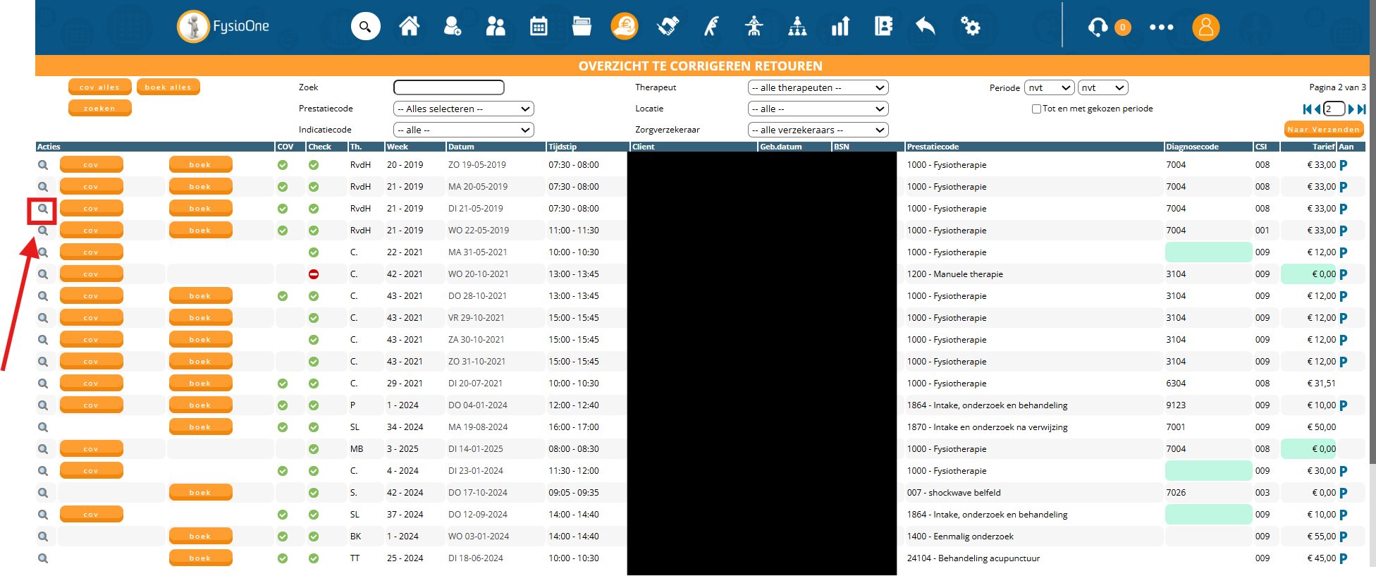 Stap 4: De behandelingen worden in FysioOne gecrediteerd en verplaatst naar het bakje ‘retouren‘. Hier heeft u de mogelijkheid om de behandeling aan te passen en opnieuw in te dienen.