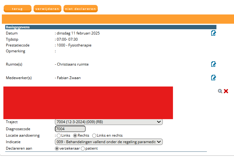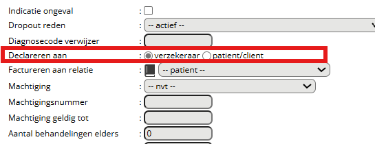 Voor het declaratieproces moeten we ook zorgen dat de juiste declaratiegegevens kunnen worden meegestuurd na het plannen van de afspraak. Deze informatie is ook relevant voor het verwerken van de retouren en andere stappen in het declaratieproces. In deze paragraaf lichten we uit waar u de relevantie informatie voor declareren kunt invullen en aanpassen in FysioOne.