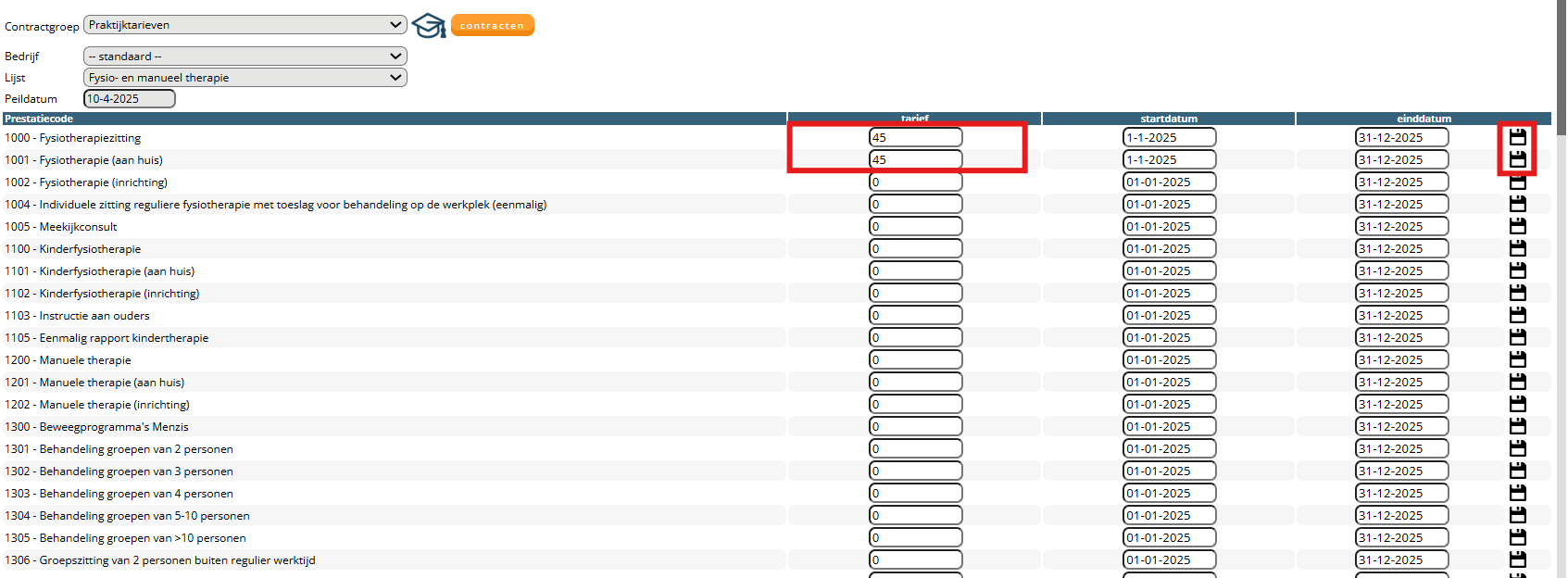 Ook is het belangrijk dat de praktijktarieven staan ingevuld. Deze kunt u controleren via configuratie – algemeen – declaratie tarieven – contractgroep selecteren op ‘praktijktarieven’ – controleer tarieven. Ontbreken hier de praktijktarieven? Vul deze dan achter de prestatiecodes in die u gebruikt en sla dit na iedere regel op middels het diskette icoon. Door de peildatum aan te passen, kunt u tarieven uit andere jaren aanpassen: