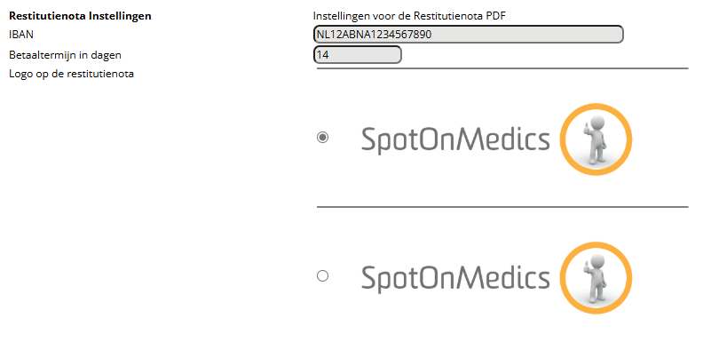 Voor de samenstelling van de restitutienota is het belangrijk dat u de benodigde informatie invult bij Basisgegevens en Omgeving instellingen -> Facturatie > Onderaan de pagina. Hier vult u het IBAN nummer in waarop moet worden gefactureerd, de betaaltermijn en het logo dat u wilt tonen op de nota’s: