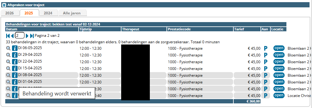 Ga naar de patiëntenkaart van de patiënt die u wilt crediteren, open het traject in kwestie en bekijk de behandelingen in het traject. Afgehandelde behandelingen staan als donkergrijs gemarkeerd: