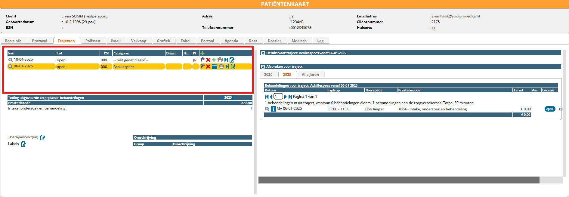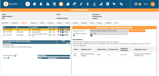 De belangrijke informatie voor het declareren vindt u terug in de trajecten. U vindt deze in de patiëntenkaart onder het tabblad ‘Trajecten’. In deze paragraaf zullen we kort ingaan op de trajectstructuur en hoe u deze aanmaakt.