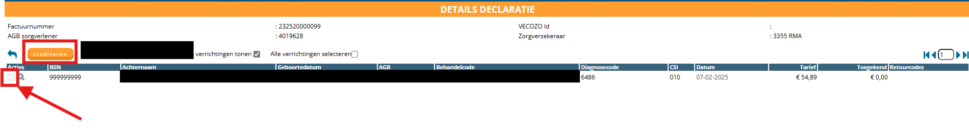 Stap 2: wanneer u middels het loepje het retour bestand opent, ziet u dat de reeds retour gekomen behandelingen zijn aangevinkt. U dient hier alleen op de button ‘crediteren’ te klikken. Bij behandelingen die deels zijn toegekend wordt het verschil tussen het berekende bedrag en het toegekende bedrag gecrediteerd.