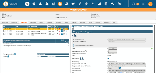 De gegevens die relevant zijn voor declareren vindt u voornamelijk in de details van het traject (In de patiëntenkaart > Tabblad ‘trajecten’):