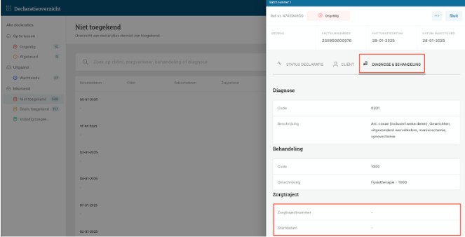 Het zorgtrajectnummer en zorgtraject startdatum waarmee een behandeling is gedeclareerd, is in het nieuwe declaratie overzicht terug te vinden bij de details.